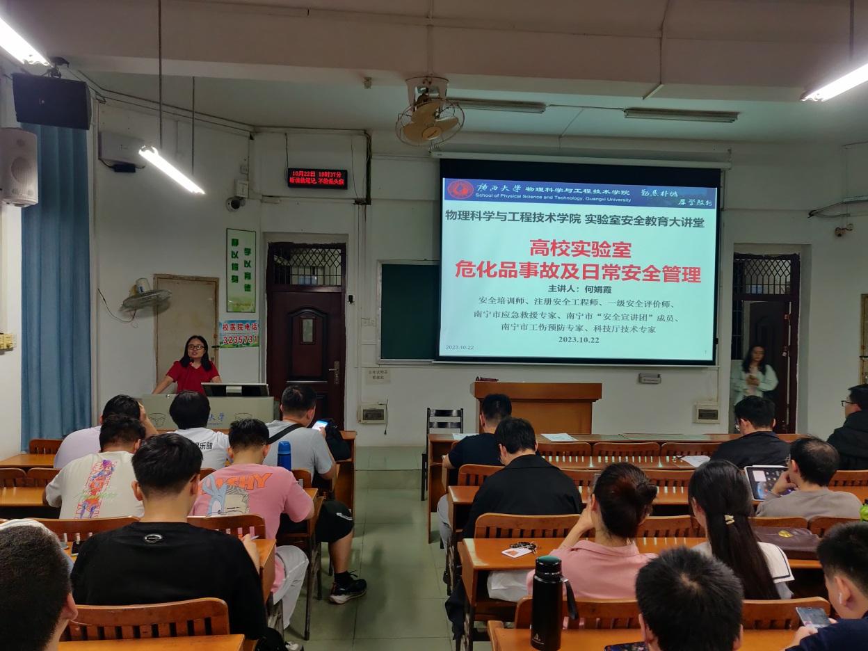 何娟霞老师以及实验中心潘智毅副主任进行授课。陆副院长从事故案例分析入手,为学生们详细介绍了实验室安全教育的重要性、如何认识实验室的危险、如何做好实验室的安全工作以及新生在进入实验室前的注意事项等内容,为新生认识实验室安全奠定了基础。何老师作为安全领域的专家,从安全专业的角度为新生介绍了危险化学品和实验室气瓶的基本特性,如何有效预防实验室危化品和气瓶事故,最后为大家分享了自己在安全教育领域的研究心得和安全工作的思考,提高了新生对危化品和气瓶等安全隐患的认识。潘副主任以安全教育的重要性和太阳城博彩