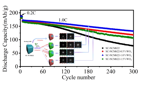 新能源材料团队开展了钨对单晶富镍三元正极材料的单包覆、单掺杂、既包覆又掺杂等不同形式的改性研究,研究成果以"Multi-role surface modification of single-crystalline nickel-rich lithium nickel cobalt manganese oxides cathodes with WO3 to improve performance for Lithium-ion batteries"为题发表在《Nanomaterials》期刊上。