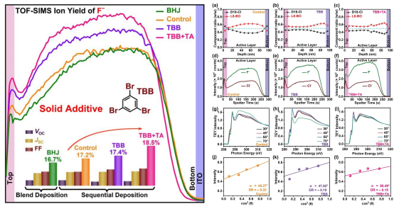 工作一:"Vertical Phase Regulation with 1,3,5-Tribromobenzene Leads to 18.5% Efficiency Binary Organic Solar Cells",太阳城博彩