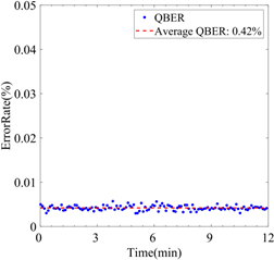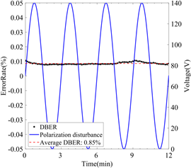 图2 误码率测量。(a)安全检测模块在12分钟内的DBER测量。每个数据(黑点)的采集时间约为8.5 s(采集数据的时间为8 s,处理时间约为0.5 s)。红色虚线代表DBER的平均值。 蓝色实线表示周期为3分钟的偏振扰动。右轴表示对EPC施加的电压。(b)编码模块的QBER测量,时间周期为12分钟。每个数据(蓝点)的采集时间约为6秒(采集数据的时间为5秒,处理时间约为1秒)。红色虚线代表QBER的平均值。