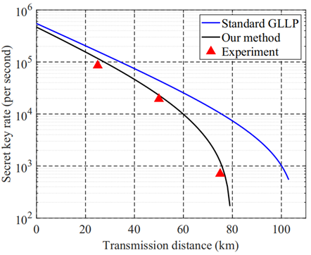 蓝线是不考虑缺陷的经典GLLP曲线,黑色是本文考虑缺陷和有限长的理论曲线,红色三角是数据点。可以看出,即使在考虑多种缺陷的联合作用下,我们的安全性模型仍然可以在75km处恢复安全密钥。