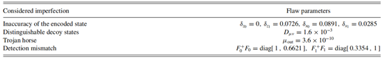 表一中展示了我们测量的四种缺陷参数,我们将缺陷参数考虑进密钥率模型中,并考虑有限数据量情况,密钥率结果如图二所示: