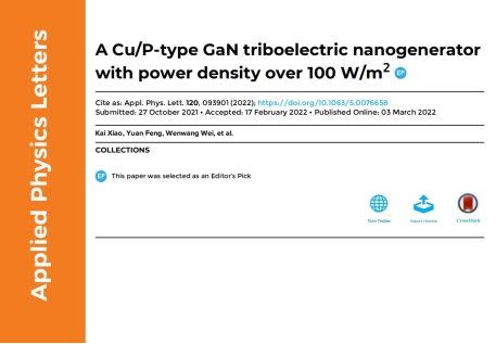 孙文红团队在Nature Index著名学术期刊《Applied Physics Letters》上发表了题为“A Cu/P-type GaN triboelectric nanogenerator with power density over 100 W/m2”的研究论文。该论文被编辑选为“Editor's Pick”文章,在APL官网太阳城博彩加以重点展示(Editor's Picks serve to highlight articles with excellent scientific quality and are representative of the work taking place in a specific field)。