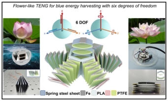 蓝色能源团队设计开发了一种花形TENG,其展示了出色的六自由度动能收集能力,可适用于变化多端的气候和海流条件,在自供电海洋传感器和构建海洋分布式供能系统方面具有广阔应用前景。