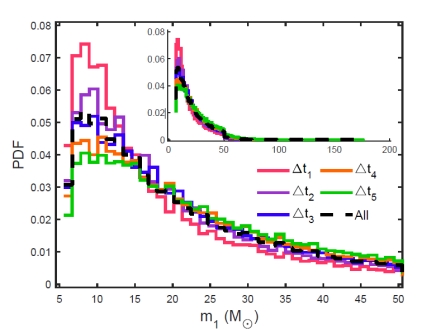 在过往研究AGN channel双致密星并合中,大都集中在迁移过程或迁移陷阱方面,但我们注意到由于黑洞的对齐时间远大于迁移时间,因此忽略了迁移时间,着重考虑对齐时间,并提出AGN不同时期可能具有不同的并合特性。基于此,我们基于蒙特卡洛模拟,研究了AGN channel双致密星并合中双黑洞的质量、质量比统计分布,发现: