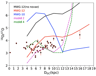 Fig 2. The radical gradient of 18O/17O in the Galaxy compare with five Galactic chemical evolution (GCE) model。