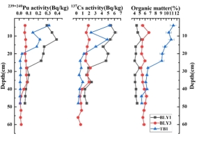 团队对秦岭山区森林土壤中放射性核素的分布进行研究,测量了239+240Pu和137Cs的比活度,并计算了240Pu/239Pu原子比。研究发现该地区土壤中239+240Pu和137Cs的比活度分别为0.001-0.501 Bq/kg和0.27-7.82 Bq/kg,240Pu/239Pu原子比的平均值为0.188±0.014。在土壤柱样的垂直分布中,大部分239+240Pu比活度的值均是在表层或次表层达到最大值,随后随着深度的增加而指数减少。对比其他地区的土壤样品,秦岭山区森林土壤中239+240Pu的比活度并不是很高,这主要是由于海拔高度、降雨量以及土壤有机质导致的。而对比秦岭山脉东西两测土壤中的239+240Pu比活度,结果表明东西两测土壤中的239+240Pu比活度并无明显差异,所以秦岭上空的大气气流活动并没有对秦岭山区森林土壤中的239+240Pu比活度造成影响。秦岭山区森林土壤中天然放射性核素的比活度均低于我国土壤中的平均水平,说明研究区域无外来污染。本研究建立和丰富了我国秦岭山区森林土壤中钚同位素放射性的数据库,对深入了解全球核活动所产生的影响有一定的意义。同时,这也为中国土壤的放射性核素含量提供了重要数据,为今后对秦岭山区土壤中放射性的风险评估提供了一定的根据。