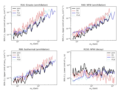 图1:DAMPE和Fermi-LAT联合分析给出的对暗物质直接湮灭(衰变)到光子的截面(寿命)的限制(95%置信水平)。相较于之前仅采用Fermi-LAT(蓝虚线)或仅采用DAMPE(红线)数据的分析,我们的结果(黑线)得到了很大的提升。四幅图对应不同的暗物质分布模型。