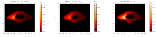 文章讨论了三种被薄吸积盘包围的黑洞的光学特性。利用数值积分和半解析方法计算了光在每个黑洞附近的偏转角度,结果表明两种方法都能有效地阐明黑洞周围光线偏转。论文同时研究了不同视角下的吸积盘光学外观,发现吸积盘内侧靠近黑洞的区域的光度高于外侧,这是由于靠近黑洞的物质密度更高。观察到吸积盘左侧明显的亮度积累,这归因于物质的运动和几何效应。结果强调了观测倾角对结果的显著影响,增大观测倾角会导致高阶图像的分离。同时,建立了磁荷与观测通量之间的关系并提出三种假设函数模型,并将它们拟合到数据中,发现Bardeen黑洞的观测通量与磁荷呈线性增加关系,黑洞吸积盘的磁场是由其内部的等离子体产生的,磁场的大小取决于磁荷密度和等离子体的运动速度。此外,该研究还指出Bardeen黑洞与Schwarzschild黑洞之间的关系更为密切,而Hayward黑洞的二次像与最内层稳定圆轨道之间的差距非常小,这不同于其他类型黑洞。随着EHT观测精度的提高,我们认为可以利用Hayward黑洞的这一特征作为分辨黑洞种类的指标。