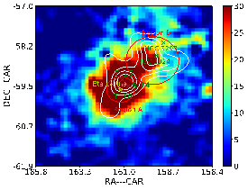 硕士研究生葛婷婷和导师孙晓娜与中国科技大学杨睿智教授等合作,基于Fermi卫星的高能粒子探测器LAT最新的观测数据,研究船底座星云复合体中大质量星团Tr 14和Tr 16周围GeV伽马射线辐射,发现这个区域存在扩散的GeV伽马射线辐射,其空间分布与分子气体一致,用两个高斯盘的空间模型可以很好地解释。两个区域的伽马射线能谱分布均可用轻子和强子两种模型去拟合。区域A的谱较软且显示了一个明显的pion-bump特征,可能是由于A区的双星系统过亮引起,或是双星系统加速的软宇宙线和气体相互作用导致,但也不排除双星系统和大质量星团共同加速宇宙线的情况。B区的高气体密度和伽马射线辐射与分子气体之间较好有空间一致性,其伽玛射线辐射可能起源于强子辐射。两个区域的宇宙线径向分布不符合1/r的关系,可能由于该系统中的宇宙线是来自最近的一些脉冲过程,而不是持续注入的。