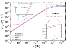 。最后我们对比了该模型辐射的强度和FAST以及Swift/XRT的灵敏度,发现FAST无法被触发,而Swift/XRT可以被该模型对应的辐射触发(右图)。