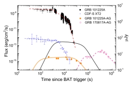 伽玛射线暴GRB 101225A多波段光变曲线非常奇特,其起源一直存在争议。研究小组提出该暴由一个大质量、具有显著进动的磁星所驱动,由于偏离伽玛暴喷流轴线而没有探测到伽玛暴本身,观测到的软伽玛射线和X射线来自磁星的磁偶极辐射。他们发现该暴后4900秒到7500秒的X射线耀光变存在准周期(QPO)信号。通过考虑磁星的进动,假设磁星自旋变慢主要由引力波辐射占主导,其整个伽玛射线/ X射线光变和QPO特征可以用磁星偶极辐射模型解释。将GRB 101225A与极度偏轴的GRB 170817A进行比较,他们提出GRB 170817A喷流结构的双成分可能起源于共轴GRB喷流和磁偶极辐射抛射物。