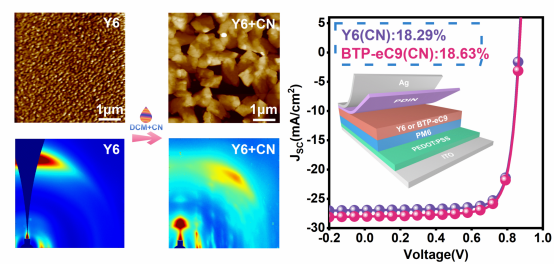 薄膜光伏研究团队创新性的使用“不良溶剂与微量高沸点良溶剂添加剂”的“共溶剂”策略,在室温下调制了具有不同尺寸和形状的多晶结构,克服了高温对有机光伏电池不可控影响的问题。研究证实,不良溶剂可以诱导非富勒烯受体的生长,而高沸点的溶剂添加剂可以延长受体的生长时间,在二者的共同作用下,最终实现了具有微米级别的多晶结构,并且添加剂通过调控溶解度的不同,获得了具有不同形状和尺寸的多晶结构。因此,基于PM6/BTP-eC9作为活性层的双层有机光伏电池不仅获得了18.63%(上海微系统与信息技术研究所认证效率18.17%)的光电转换效率,而且在1000h的储存时间后仍然保持了93.3%的初始效率值。同时,这项研究也通过双层活性层结构证实了,溶剂添加剂是通过优化受体的形貌(而不是给体)来实现器件性能上的提升。这项研究的结果揭示了溶剂添加剂对受体多晶结构的调制作用,对于实现高效的双层有机光伏电池影响深远。