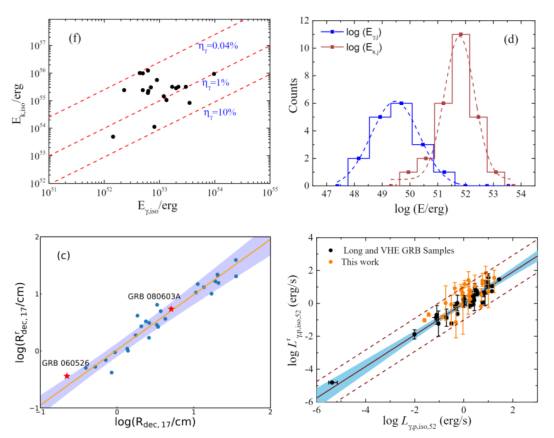博士生张璐璐与导师梁恩维教授合作在伽马暴余辉光变的样本分析研究中取得进展。通过收集整理Swift卫星发射以来的光学和X射线余辉的观测数据,选择了早期光学光变曲线呈现明显标准光变曲线特征的30个伽马暴样本。基于标准正向外激波型、采用贝叶斯推断方法,我们拟合了这些样本的光学和X射线余辉观测数据,给出相关物理参数的后验分布,计算了与喷流相关的物理量。研究发现,该样本的瞬时辐射效率分布范围为0.04%-10%,与物质主导喷流模型预测的低辐射效率一致。经几何修正后,瞬时辐射能量和喷流动能均表现为比较紧凑的正态分布,与前人提出的伽马暴喷流具有标准能量库的假设相吻合。特别地,研究发现火球减速半径(Rdec)、初始磁场强度(B0)以及磁场和电子的能量分配比例参数σB(σB=εB/εe)之间存在紧凑的依赖关系Rrdec,17=101.00±0.05B0-0.83±0.06σB0.26±0.02,该关系推断不同样本的喷流中电子所携带的能量占比基本一致。该样本同典型的长伽玛暴在3σ置信度水平内同样遵循Lγ,iso − Ep,z − Γ0三参量关系。本研究成果已被《The Astrophysical Journal》杂志接受发表。