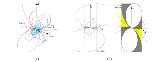 大学的研究人员,利用中国天眼FAST对全相位辐射的射电脉冲星B0950+08进行偏振观测,绘制出了脉冲星B0950+08的三维磁层结构和子午面辐射几何(磁轴和自转轴共面),如图1所示