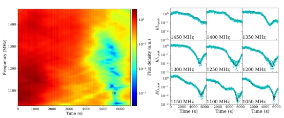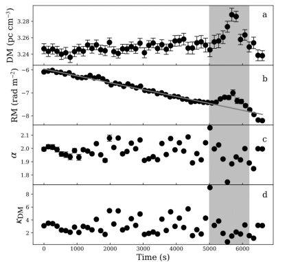 大学的研究人员。利用中国天眼FAST对正常射电脉冲星B1929+10进行110分钟的长时间跟踪观测,发现该脉冲星的光变曲线在20分钟左右下降3个甚至超过3个数量级。且在低于1150MHz频率上(黄色斑带),发现等离子透镜效应,如图1所示所示。与此同时,色散量(DM)和旋转量(RM)也发生显著的变化,其变化强度分别为0.05 pc cm⁻³和0.7 rad cm⁻² ,如图2所示。