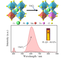 通过引入稀土元素铕离子(Eu3+)对Mn2+:CsPbCl3纳米晶进行共掺杂,显著提高了纳米晶的PL QY,达到90.92%。Eu3+的掺入减少了非辐射复合,提升了激子向Mn2+的能量转移效率,并增强了紫外光和水的稳定性。该方法不仅优化了发光性能,还为开发更高效的钙钛矿纳米晶材料提供了新的思路。相关结果发表在《》(,中科院一区)
