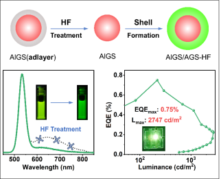 本研究采用一步法制备的AIGS/AGS量子点表现出纯绿光发射(532 nm),发射峰的全宽半高(FWHM)仅为33 nm,展现了极高的色纯度。研究发现,HF处理的引入有效去除了AIGS核表面吸附的低结晶度硫化镓和硫化铟层,从而实现了AGS壳的均匀生长。这一过程不仅优化了量子点的表面结构,还显著提升了其色纯度和光稳定性,相较于未经过HF处理的量子点具有明显的性能优势。作为概念验证,研究人员利用这种HF辅助单锅法合成的AIGS/AGS量子点制备了QLED器件。实验结果显示,这些QLEDs具有窄电致发光FWHM(36 nm)、低开启电压(2.2 V)和2747 cd/m²的高亮度输出,外量子效率(EQE)达到0.75%。这一结果为高效环保型发光器件的设计提供了新思路。
