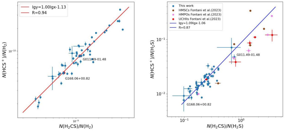 硫(S)是宇宙中含量第十的元素,与氢的相对丰度约为1.3×10-5,硫元素在许多星际分子中存在。含硫分子是确定大质量恒星形成区内部物理条件的有力工具。包括H2S、H2CS和 HCS+在内的含硫分子的丰度高度依赖于物理和化学变化,这意味着它们是大质量恒星形成演化阶段的良好示踪剂。