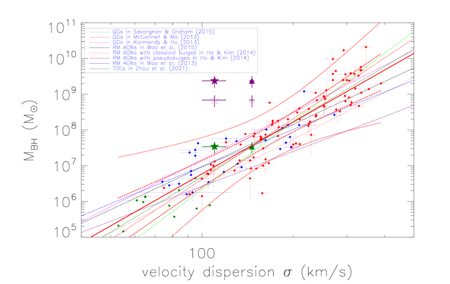 Fig. 1: Properties of SDSS J1241+2602 in the space of BH mass versus velocity dispersion. Large symbols in dark green show the results without considerations of obscurations, large symbols in purple show the results with considerations of obscurations.