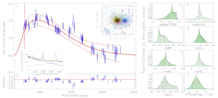Fig. 1: Long-term light curves from the CSS and the TDE model determined best descriptions. Right panels show the posterior distributions of the model parameters. In the bottom-left corner in panel a, spectroscopic results are shown with solid blue line related to TDE and dashed blue line related to AGN.