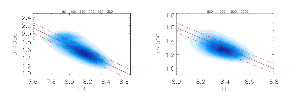 Fig. 1: On the dependence of 4000\AA break on our proposed parameter LR. Solid and dashed red lines show the best fitting results and the corresponding 1RMS scatters.