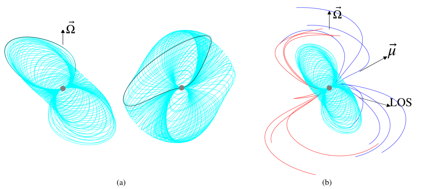 分析全相位射电辐射脉冲星B1929+10的偏振辐射信号,进行磁偶极场的旋转矢量模型拟合,获取该脉冲星的磁倾角α和视线角ζ,它们分别是55°.62和109°.9研究人员构建和研究该脉冲星的3维磁层结构和辐射几何。如图3所示,发现该脉冲星的磁层结构随着磁层高度变大呈现方向性扭曲,和出现一团磁力线在低海拔区域聚集在一起。磁层的这些结构特征很好地解释了该脉冲星全相位射电辐射特征。全相位射电辐射脉冲星辐射,挑战了脉冲星经典的理论模型,促进了天文学家对脉冲星辐射新的理解和推进了脉冲星理论模型向新的方向发展。该研究成果已于2025年8月27日发表在国际天文顶级期刊Astronomy and Astrophysics上。