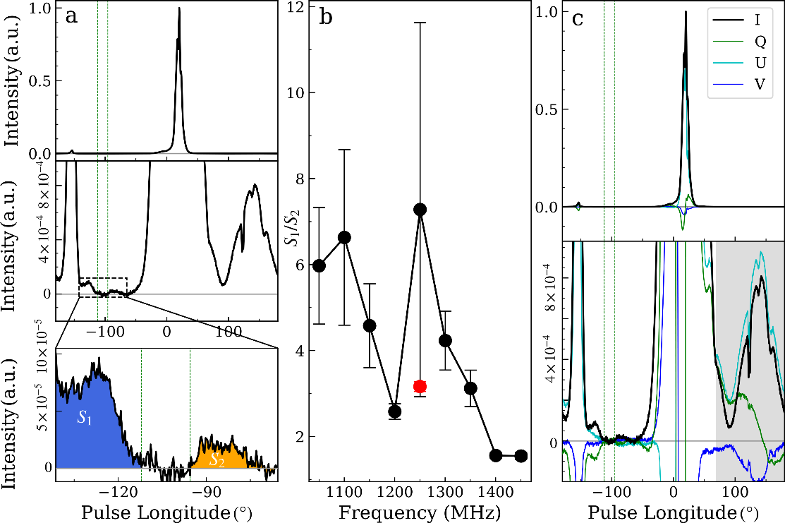 图1、脉冲星B1929+10辐射特征。左边子图显示的是首次发现的两个微弱辐射成分;中间子图描述的是两个微弱成分强度比例随频率演化关系;右边子图对应的是脉冲星B1929+10偏振轮廓特征。其中灰色区域显示的是偏振强度大于总强度,这是由于基线位置估算不准确导致的。