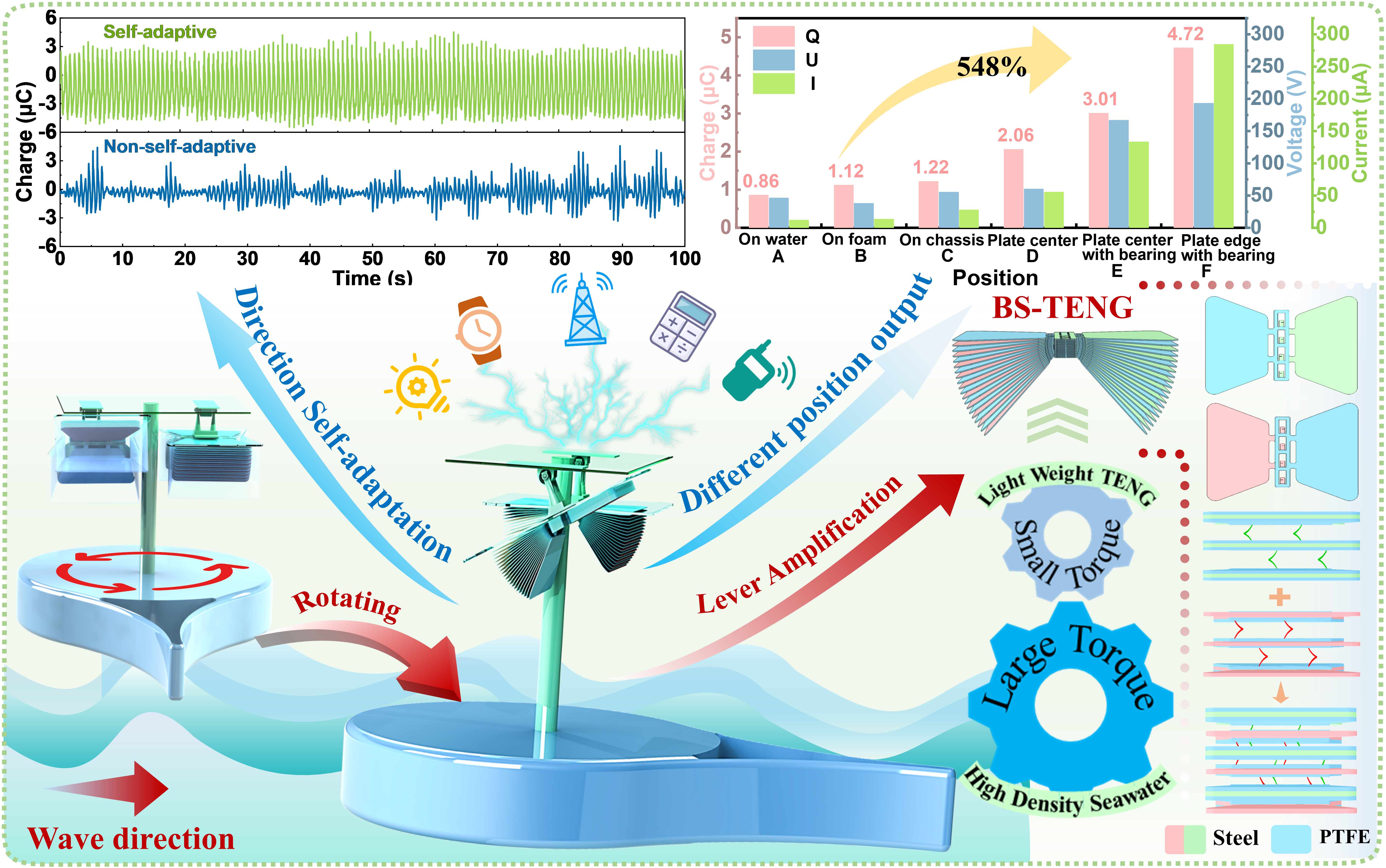 为了解决以上问题,我院蓝色能源团队设计了基于自适应平台的仿生向日葵方向调整策略以及相应的新型蝶形堆叠摩擦纳米发电机(Butterfly-stacked triboelectric nanogenerator, BS-TENG)。该系统不仅可以在无额外电力消耗下自动调整自适应平台朝向使其对准波浪方向,从而使悬挂其上的BS-TENG高效捕获波能。还利用了杠杆原理将低振幅、高扭矩的波浪能转化为高振幅、低扭矩的动能,从而使致密摩擦层能够充分地接触分离,在弱波条件下与直接漂浮水面的BS-TENG相比,基于自适应平台的BS-TENG电荷输出提高了548%,显著提高了能量利用率。BS-TENG由半覆膜激光蚀刻的Si-Mn 弹簧钢板制成,消除了内部布线、框架和惯性质量。这种超轻设计简化了制造和材料消耗,实现了6.75 cm²g-1的质量摩擦面密度(SSA)。系统研究了该平台的工作机理和输出特性,单个BS-TENG的最大转移电荷量达到了13.68 μC,并证明了有效收集弱波能量为多个电子设备供电的可行性。该策略可与各种收集波浪能的TENG 轻松集成,为弱波浪能收集提供了一种可扩展且经济高效的解决方案。